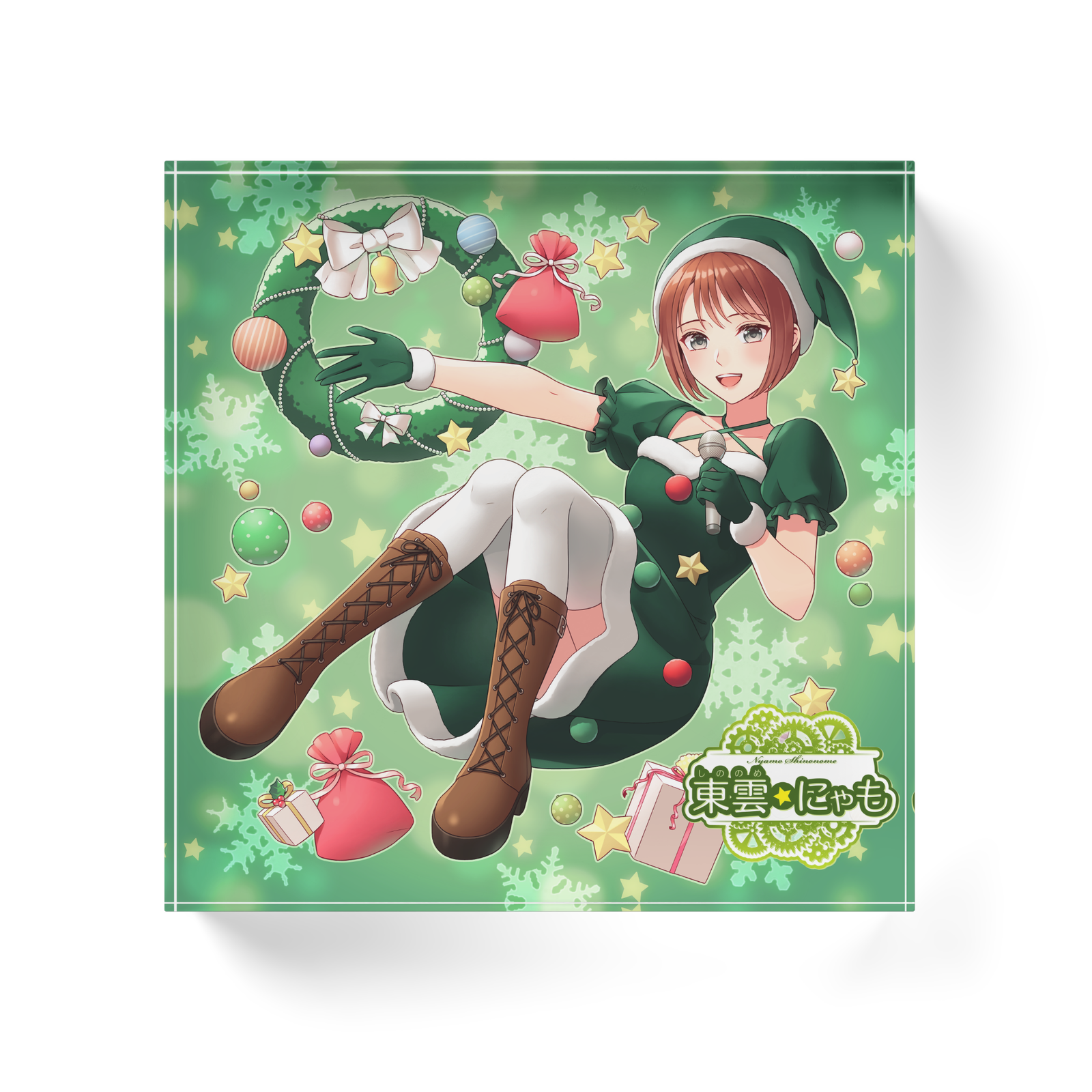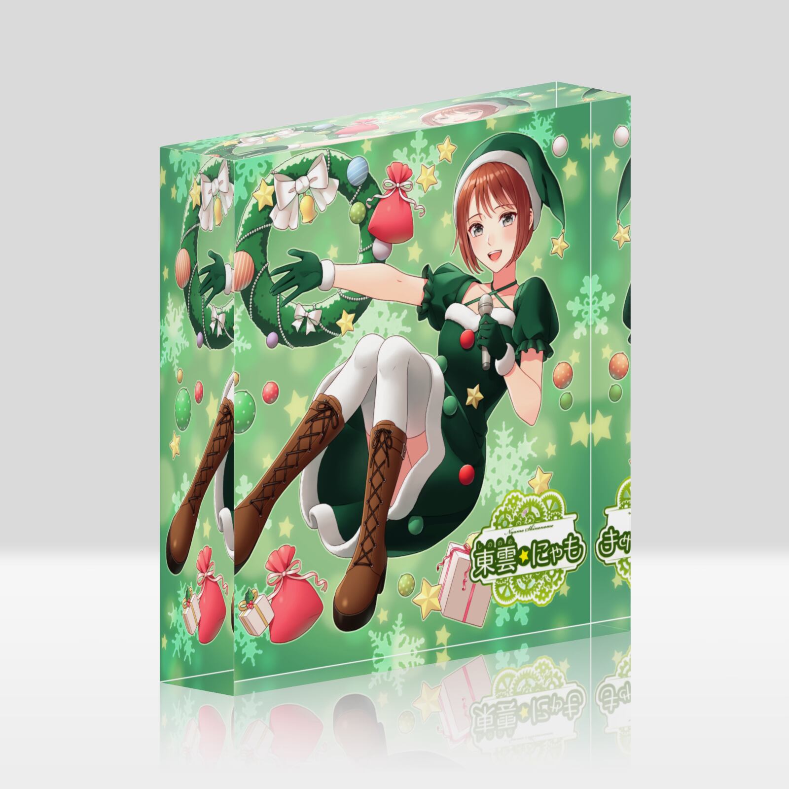 にゃもさんのかわいいクリスマスツリードレス姿のアクリルブロック。